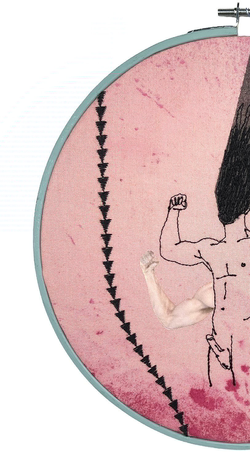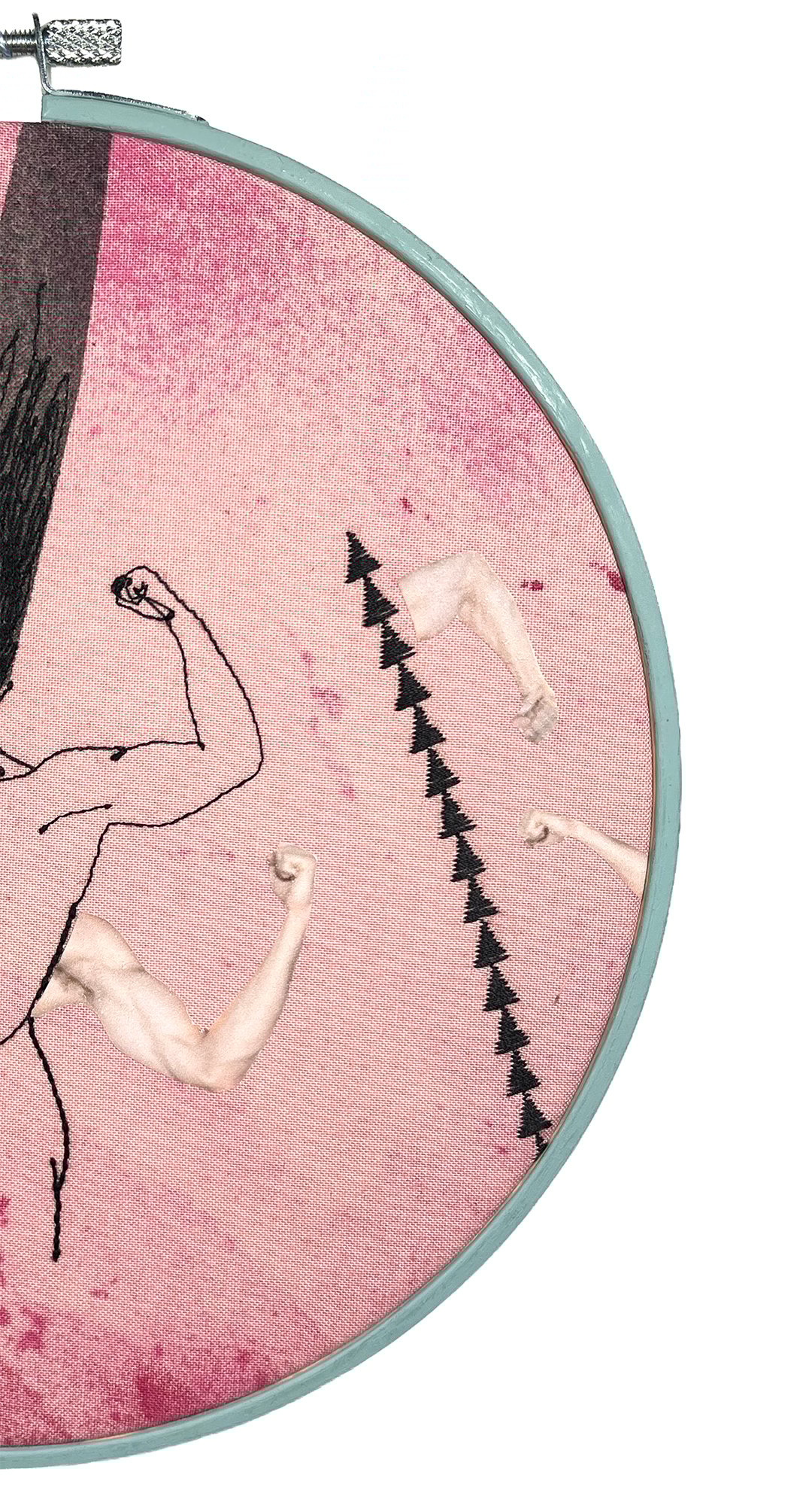 Embroidery, dye & digital artwork. In a hand painted wooden embroidery hoop (208mm)